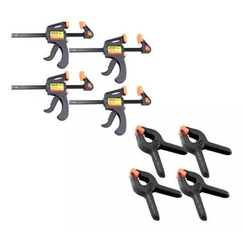 O Kit 4 Grampo Sargento + Jogo Com 4 Peças Grampos Alicate é perfeito para marceneiros e carpinteiros que desejam fixar peças durante processos de colagem, fixação, montagem de móveis e muito mais.