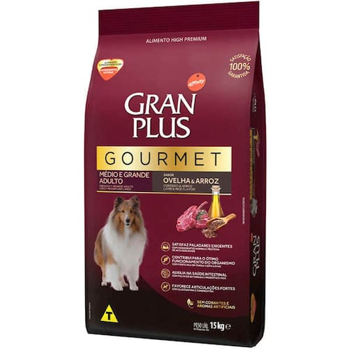 Ração Gran Plus Gourmet Cães Adultos Raça Média/Grande Ovelha e Arroz - 15kg- Alimento conservado com antioxidantes naturais; - Condroitina e Glicosamina: contribuem para articulações fortes; - Possui ingredientes nobres e proteína de alta qualidade: atende paladares exigentes; - Com fonte rica em Ômega 3 (EPA & DHA): contribui para o excelente funcionamento do organismo; - Contém polpa de beterraba, prebiótico MOS: auxilia na saúde intestinal; - Embalagem de 3 Kg: sistema abre e fecha promovendo mais sabor, frescor e maior conservação.