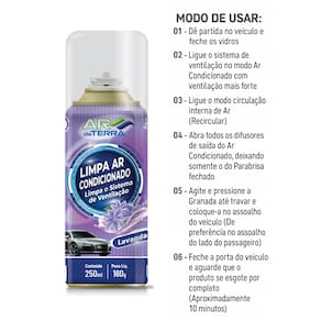 Ar da terra Limpa Ar condicionado é a formulação perfeita para eliminar o mal cheiro de seu sistema de ar condicionado. Com o Ar da Terra Limpa Ar condicionado você limpa e perfuma o sistema de ventilação de maneira simples, rápida e com excelente custo benefício. Esse produto tem um sistema simples de utilizar, funciona como uma granada, que deve trabalhar no interior do carro sem que haja ninguém dentro.