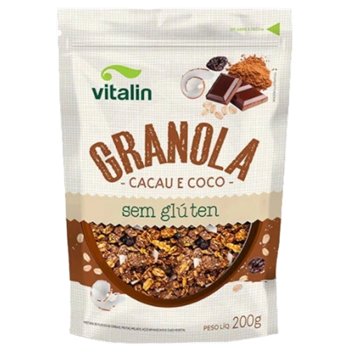 A Granola Cacau e Coco Sem Glúten Vitalin leva como base aveia em flocos e conta com ingredientes de alto valor nutricional.