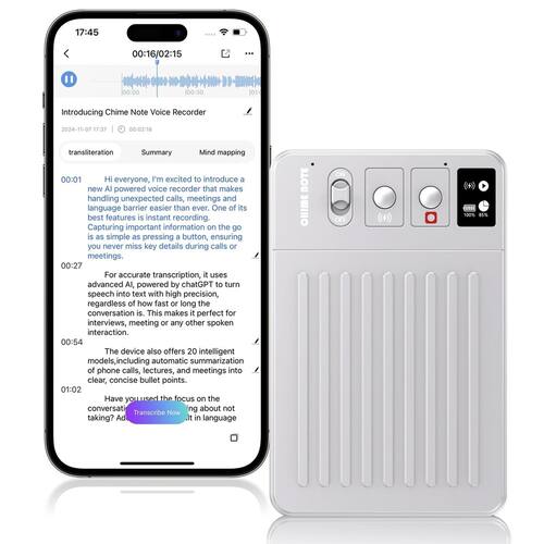 1 - ??Sem taxa e sem limite de tempo para transcrição e resumo?: ao contrário de outros gravadores de voz AI no mercado, o gravador de voz CHIME NOTE AI não tem custo nem limite de tempo para transcrição inteligente e resumo! Você pode gravar e transcrever o quanto precisar sem se preocupar com taxas de assinatura ou restrições de uso. Economize pelo menos US$ 10 por mês para você!! ! - ??Aplicativo ChimeNote e sincronização WEB e pasta personalizada?: Sincronize suas gravações sem esforço entre o aplicativo e a web, garantindo acesso aos seus arquivos a qualquer hora, em qualquer lugar. - A função de pasta personalizada permite que você use e organize seus arquivos de gravação exatamente como você quiser. O gravador de voz AI ajuda seu trabalho a permanecer eficiente, organizado e sempre sincronizado. - ??Suporta 107 idiomas e carregamento magnético sem fio?: O gravador de voz CHIME NOTE AI suporta transcrição e resumo em 107 idiomas. Se você estiver trabalhando com inglês, espanhol, chinês ou outros idiomas, o dispositivo gravador garante transcrições e resumos precisos. É equipado com uma bateria de 3000 mAh que suporta carregamento magnético sem fio, tornando incrivelmente fácil recarregar seu dispositivo. - ??Privacidade e segurança de dados?: A CHIME NOTE prioriza sua privacidade primeiro, oferecendo armazenamento seguro na nuvem e proteção de dados criptografados, garantindo que seus arquivos sejam criptografados e acessíveis apenas por você. Suas gravações e transcrições são armazenadas com segurança e você tem controle total sobre o acesso aos seus dados. Você pode acessar seus arquivos de qualquer dispositivo, baixá-los ou compartilhá-los com outras pessoas, sabendo que suas informações são mantidas seguras e privadas. - ??Transcrição automática?: diga adeus às anotações manuais. Este gravador de voz AI e anotador permite que você converta suas gravações de áudio em texto sem esforço, economizando tempo e esforço, esteja você gravando uma reunião, uma palestra ou um memorando pessoal. E durante gravações longas, o gravador salva automaticamente cada segmento de 1 hora e continua gravando até você pará-lo. Certifique-se de que você está usando a versão mais recente do aplicativo. - ??Resumo instantâneo?: o gravador de voz CHIME NOTE oferece resumo em tempo real de suas gravações, alimentado por ChatGPT-4o. Este recurso extrai rapidamente pontos-chave e fornece resumos concisos e bem organizados de suas conversas ou eventos; você pode obter uma visão geral clara sem filtrar transcrições longas. É ideal para profissionais ocupados que precisam de uma visão geral rápida das reuniões ou estudantes que desejam se concentrar nas principais ideias em palestras. - ??Gravador de voz AI CHIME NOTE?: O gravador de voz AI CHIME NOTE integra-se perfeitamente com a colaboração ChatGPT-4o, um modelo líder de linguagem AI. Esta colaboração permite a transcrição altamente precisa e inteligente de áudio em texto. Se você estiver gravando uma reunião, palestra, entrevista ou sessão de brainstorming, o CHIME NOTE transforma instantaneamente suas palavras faladas em texto escrito com precisão incomparável. Este gravador de áudio inteligente melhorou muito a eficiência do seu trabalho diário. - ??Amplo uso?: é amplamente utilizado em vários cenários, como chamadas, reuniões, palestras, conferências, seminários, sessões de estudo, ensino de professores, pesquisa, consultas de pacientes, transcrição de notas médicas, captação de discussões durante conferências médicas ou diário de escrita de voz e assim por diante. - ??Perfeito para todas as pessoas?: perfeito para profissionais de negócios, estudantes, educadores, jornalistas, escritores, criadores de conteúdo, podcasters, produtores de vídeo, médicos, advogados, estudantes de idiomas, pesquisadores, profissionais de saúde, conselheiros cardíacos e muito mais!