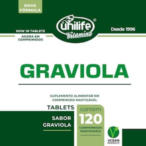 A Graviola da Unilife é um suplemento alimentar em comprimidos mastigáveis com sabor natural da própria fruta. A graviola é uma fruta tropical conhecida por conter compostos como vitaminas, minerais e antioxidantes naturalmente presentes em sua polpa e folhas. Esse suplemento é uma alternativa prática para quem deseja incluir a graviola na alimentação de maneira conveniente. Livre de lactose e não contém glúten.