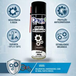 Graxa de Lítio em Spray Onyx Plus Descrição do Produto: Graxa de lítio com óleos básicos parafínicos, formulada para proporcionar lubrificação de alta performance e proteção duradoura. Sua composição garante excelente resistência à água, proteção eficaz contra a corrosão, além de uma elevada estabilidade mecânica e resistência à oxidação. O formato em spray facilita a aplicação em áreas de difícil acesso.