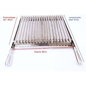 Grelha argentina parrilheira em inox - 60cm largura x 45cm profundidade útil comprimento total 67cm Inove seu churrasco com a grelha argentina, também chamada de picanheira, um ótimo acessório para o preparo de seu churrasco. Surpreenda-se com um assado de carne suculenta. As canaletas mantém o suco da carne e o excesso escoa para o coletor e evita que caia na brasa e levante labaredas. Utilidade:Com a grelha argentina é possível assar todo tipo de carne, legumes, pão de alho.Pode ser utilizada em churrasqueiras de alvenaria, gourmet, portáteis.Estrutura super reforçada em inox e com abertura lateral facilitando a limpezaCanaletas com espessura de 0,7mm - produto durávelCabo de madeira revestido de alumínioMaterial - toda em inox 430Não enferrujaLargura: 60cmProfundidade: 45cmProfundidade total: 67cmMarca plenitude