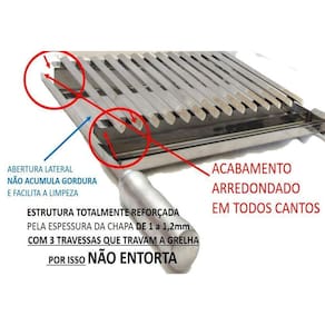 Observações: a grelha pode ter variação na largura de até mm maior, são características do processo de produção marcas de solda a ponto aparentes foram necessário reforço nas soldas, por causa do transporte . Verifique o espaço do vão de sua churrasqueira antes de comprar largura e profundidade.
