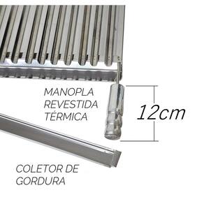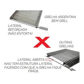Fábrica em aço inox 430 de excelente qualidade e durabilidade. Estrutura reforçada em chapas de aço inox, soldadas à dois ferros maciços tarugos de 1/4 em inox 304 que ajudar a reforçar a grelha. Possui sistema de canaletas que ajudam a escoar a gordura das carnes até o reservatório o qual evita fumaças no churrasco e formação de labaredas de fogo atrapalhando o churrasco. Você pode pincelar a gordura que escoar até a canaleta na carne deixando mais suculenta e saborosa. Pode também acrescentar temperos na canaleta para que quando a gordura escoar fique temperada e ao pincelar na carne dará um sabor surpreendente.
