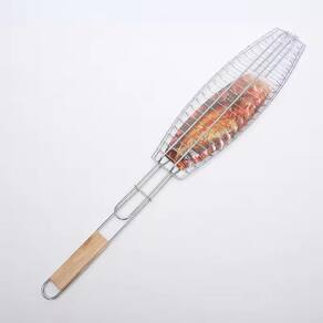Grelha de Aço Carbono com Cabo de Madeira 65x12CM Grelha dupla côncova excelente para peixes, frangos e carnes diversas; Especificações:- Feita em Aço Estanhado reforçado;- Permite virar a carne ou o peixe com muito mais facilidade na churrasqueira, evitando acidentes. Medidas:comprimento da grelha no meio: 14cm;Profundidade da grelha: 42cm;Tamanho do cabo: 25cm;Profundidade total com cabo e hastes de apoio: 67cm. Marca: Não Informado