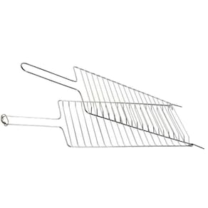 Grelha em aço galvanizado, abaulada dobrável, tamanho retangular 27x84cm . A grelha permite que se trabalhe com vários tipos de carnes ao mesmo tempo. Além de outros complementos como queijo provolone, pimentão, linguiças, tomates, cebolas e etc… Ela favorece as carnes sem osso, em detrimento das carnes com osso como a costela. Portanto as carnes mais indicadas para a grelha são a picanha, a maminha, o assado de tiras (Tiras muito finas de costela), linguiças, salsichas, chuleta, vazio ou fraldinha e o filé mignon.