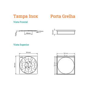 - Dimensões AxLxP (mm): - Porta Grelha: 22x100x100 - Grelha: 5x94x94 - Cor: Inox Polido - Material: - Porta Grelha em PVC - Grelha em Aço Inox 304 - Garantia: 5 anos junto ao fabricante - Referência: 5203 - Formato: Quadrado - Compatibilidade: Compatível com saída de 100mm e caixa sifonada - Sugestão de Uso: Ideal para salas de banho e banheiros em geral - Local de Uso: Interno O que vem na caixa: 1 Porta grelha de PVC 1 Grelha em Aço Inox 304