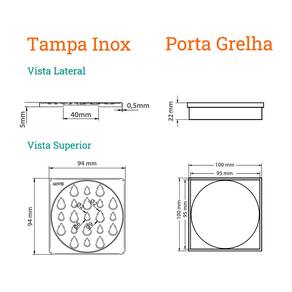 Especificações Gerais do Produto: Dimensões AxLxP (mm)Porta Grelha: 22x100x100; Grelha: 5x94x94Cor: Inox PolidoMaterial: Porta Grelha em PVC e Grelha em Aço Inox 304Garantia: 5 anos junto ao fabricanteReferência: 5205Formato: QuadradoCompatibilidade: Compatível com as saídas de 50mm e 100mm e caixa sifonadaFecha Ralo (previne o retorno de insetos pela tubulação): SimSugestão de Uso: Ideal para salas de banho e banheiros em geral.Local de Uso: Interno O que vem na caixa:1 Porta grelha de PVC1 Grelha em Aço Inox 3041 Fecha Ralo1 Adaptador em PVC para o Fecha Ralo