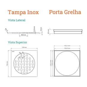 Especificações Gerais do Produto: Dimensões AxLxP (mm)Porta Grelha: 22x155,5x155,5; Grelha: 5x150x150Cor: Inox PolidoMaterial: Porta Grelha em PVC e Grelha em Aço Inox 304Garantia: 5 anos junto ao fabricanteReferência: 5206Formato: QuadradoCompatibilidade: Compatível com as saídas de 50mm, 100mm e 150mm e caixa sifonadaFecha Ralo (previne o retorno de insetos pela tubulação): SimSugestão de Uso: Ideal para salas de banho e banheiros em geral.Local de Uso: Interno O que vem na caixa:1 Porta grelha de PVC1 Grelha em Aço Inox 3043 Fecha Ralo1 Adaptador em PVC para o Fecha Ralo