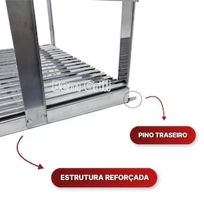 Estrutura reforçada em chapas de aço inox, soldadas à dois ferros maciços tarugos que ajudar a reforçar a grelha.