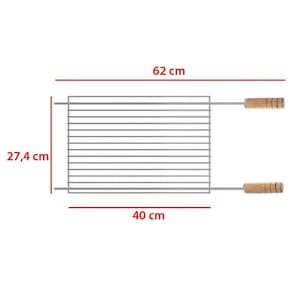 Componente exclusivo para as séries: Kit, Kit Suporte e Garden da Giragrill. Grelha Tradicional de arames da linha Inox, com proteção lateral para grelhar ou deixar espetos de churrasco em descanso na parte superior do kit. Cabos revestidos em alumínio. - Feita em aço inox, com cabos de madeira. - Muito resistente. - Grelha tradicional de arames com proteção lateral para grelhar ou deixar espetos de churrasco em descanso na parte superior do kit. CARACTERÍSTICAS Material: Estrutura em aço inox 304 e cabos de madeira marfim Peso Líquido: 1,52 kg Peso Bruto: 1,95 kg Medidas do Produto: C 62,0 x A 3,7 x P 27,4 cm Medidas da Embalagem: C 63,0 x L 28,0 x A 4,0 cm