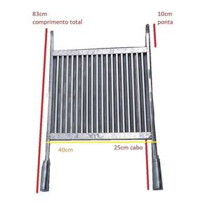 1 Grelha em Inox tipo Uruguaia com cabos de alumínio. Medida área util: 40cm largura X 48cm prof. Util - comprimento total 83cm contando com cabos, vide foto Largura com pegadores: 44cm Cabos alongados: 25cm Pontas alongadas: 10cm