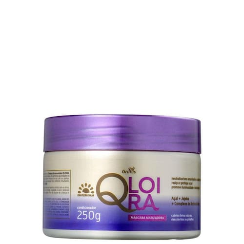 Máscara Matizadora Griffus QLoira para cabelos loiros, descoloridos e grisalhos. Remove tons de amarelo e cobre indesejados. A Máscara Matizadora Griffus QLoira promove a revitalização dos fios, condicionando e reparando da raiz às pontas. Conta com pigmentos especiais que neutralizam a cor, resgatando o tom vibrante e intenso, além de proteger contra o desbotamento.