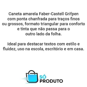 Descrição Com a grifpen amarelo faber castell, sua escrita ficará ainda mais fluida e seus textos terão destaque garantido. Possui ponta chanfrada para traços finos e grossos, além de formato triangular para maior conforto ao escrever. Sua tinta é superfluorescente e não passa para o outro lado da folha.