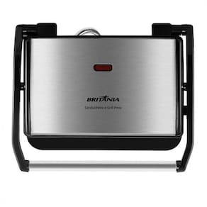 Grill e Sanduicheira Britânia 2 em 1 com chapas antiaderentes, trava de segurança, alça com toque frio, placas ajustáveis e 850W de potência.Funciona como grill