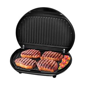 Grill tamanho família grelha até 4 hambúrgueres de uma vez. Chapa antiaderente. Coletor de gordura. LED indicador de funcionamento.