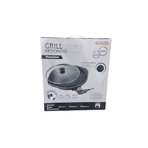 Superfície ampla de 25,5 x 25,5 cm, potência de 1200W, superfície antiaderente, bandeja coletora de gordura com água, termostato ajustável, plugue de 3 pinos, formato redondo de 40 cm de diâmetro, composição em PP, vidro e lingotes de alumínio.Termostato regulável