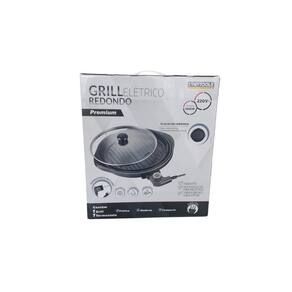 Superfície ampla de 25,5 x 25,5 cm, Potência de 1200W, Superfície antiaderente, Bandeja coletora de gordura, Termostato ajustável, Formato redondo de 40 cm de diâmetro, Dimensões 40 x 36,5 x 12 cm, Peso de 2,325 kg, Composição: PP, vidro e lingotes de alumínio.Termostato regulável