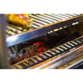 De fácil instalação (encaixe e use), conta com grelhas com manípulos removíveis, e seu sistema de elevação manual permite ajustar a altura do alimento em relação ao fogo.