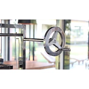 De fácil instalação (encaixe e use), seu sistema de elevação manual por volante permite ajustar a altura do alimento em relação ao fogo.