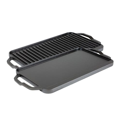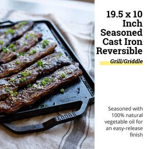Lodge A grelha reversível versátil de ferro fundido de 19,5 x 25 cm é uma chapa de queimador duplo feita em South Pittsburg, Tennessee. Feito de material durável e não tóxico, este acessório de cozinha oferece uma área de superfície de cozimento de 819 cm², o suficiente para acomodar 8 ovos ou um lote de panquecas de uma só vez! Suas alças levantadas de suporte e bandeja coletora aumentam sua praticidade e conveniência. Esta chapa reversível é uma grelha e chapa em uma, permitindo que você alterne entre uma superfície plana para grelhar os favoritos do café da manhã, como panquecas e ovos, para uma grelha estriada para grelhar bifes, grelhar legumes ou torrar pão de sanduíche. Pré-temperada com óleo vegetal 100% natural, nossa chapa de ferro fundido oferece um acabamento de fácil liberação que melhora a cada uso, tornando sua experiência culinária mais simples e agradável. Não apenas para o seu fogão de cozinha, esta chapa também é sua parceira para aventuras culinárias ao ar livre. Use-o em uma churrasqueira ao ar livre ou sobre uma fogueira — a escolha é sua. É a companhia perfeita para quem gosta de cozinhar, mas também curte o ar livre. Com suas propriedades superiores de retenção de calor, garante cozimento uniforme e a selagem perfeita sempre. Feito nos EUA, os utensílios de cozinha Lodge são feitos à mão para serem uma herança moderna que durará gerações. Com mais de 125 anos de experiência, a Lodge conhece o ferro fundido e a alegria de cozinhar com ele pode trazer. Temos orgulho de ser uma empresa familiar que ainda fabrica ferro fundido de qualidade nos EUA, em fundições verdes que colocam a inovação em prática. Ao longo dos anos, sobrevivemos e prosperamos ouvindo nossos clientes, cuidando de nossos funcionários e tendo orgulho do que fazemos. Estamos constantemente melhorando nossas operações e impacto para servir melhor nossa comunidade, nosso planeta e os clientes que nos amam.