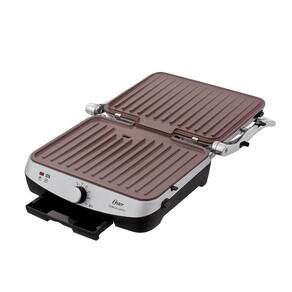 Grill Oster Bioceramic 2 em 1 com 1500W de potência, revestimento Bioceramic, controle de temperatura preciso (65C a 230C), abertura 180 graus e chapas removíveis.Termostato regulável