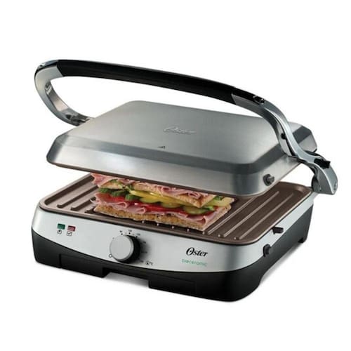 Facilidade na hora de usar ou guardar O Grill Bioceramic Oster tem um elegante acabamento em aço inoxidável.