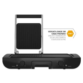 • Possui chapas lisas e onduladas • Chapa do lado esquerdo é ajustável • 2 seletores de temperatura, seletor independente para cada lado da chapa • Os seletores de temperatura possuem 7 níveis, ajuste até 220°C • Luz indicadora de aquecimento para cada lado da chapa • Chapas com revestimento antiaderente • Coletor de gordura com volume de 180ml • Base antiderrapante.