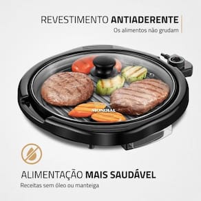 Grill Redondo Mondial Smart Grill com revestimento antiaderente, 1200W, controle de temperatura, tampa de vidro temperado e alças isotérmicas.Termostato regulável