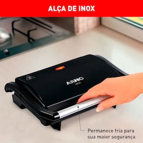 Além de eficiente, o Grill Arno Panini foi projetado para oferecer total segurança durante o manuseio. Sua alça fria ao toque evita queimaduras, proporcionando mais conforto ao abrir e fechar o aparelho. Já a trava lateral garante um fechamento seguro, permitindo que os alimentos sejam preparados com firmeza e precisão. Para completar, a luz indicadora de funcionamento sinaliza quando o grill está ligado, evitando distrações e proporcionando uma experiência de uso mais prática e tranquila.