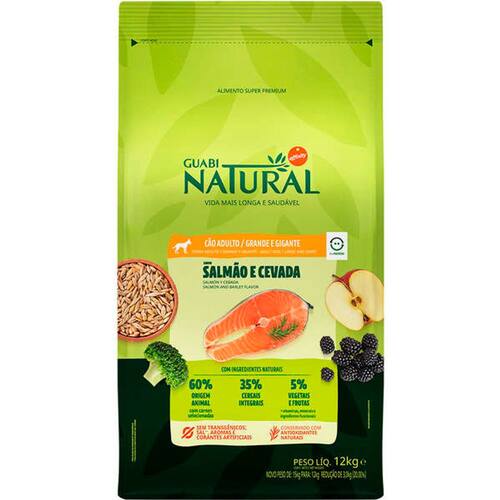 Guabi Natural Caes Adultos Grande e Gigante Salmão/Cevada 12Kg- Condição corporal equilibrada, com elevada quantidade de carnes e proteínas exclusivamente animais que proporcionam os nutrientes essenciais para a adequada condição corporal de cada porte e fase de vida;- Função intestinal regular, com ingredientes naturais, fibras e pré-bióticos, que favorecem o bom trânsito intestinal e adequada formação das fezes, além de auxiliar no controle de odores. Ideal para cães que vivem em ambientes internos;- Proteção para o organismo e longevidade, rico em ingredientes e antioxidantes naturais que proporcionam uma vida mais longa e saudável;- Saúde dos ossos e das articulações, com ingredientes funcionais que auxiliam na proteção e no fortalecimento dos sistemas ósseo e articular. A Ração Affinity Guabi Natural Salmão e Cevada para Cães Adultos Raças Grande e Gigante, é um alimento Super Premium feito com carnes selecionadas e ingredientes essenciais, sem transgênicos, corantes e aromas artificiais. Além disso, foi desenvolvido por especialistas em nutrição e aprovado por veterinários para fornecer toda qualidade e saúde que seu cão precisa.