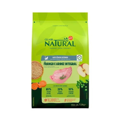 Racao Guabi Natural Gatos Adultos Castrados Senior Frango e Arroz . 7,5kg . Condicao corporal equilibrada, com elevada quantidade de carnes e proteinas exclusivamente animais que proporcionam os nutrientes essenciais para a adequada condicao corporal de cada fase de vida; . Funcao intestinal regular, com ingredientes naturais, fibras e pre.bioticos, que favorecem o bom transito intestinal e adequada formacao das fezes; . Protecao para o organismo e longevidade, rico em ingredientes e antioxidantes naturais que proporcionam uma vida mais longa e saudavel; . Saude urinaria, formulado com quantidades equilibradas de minerais e com controle de pH para auxiliar na saude do trato urinario; . Peso corporal adequado, alimento cuidadosamente desenvolvido e enriquecido com ingredientes funcionais para atender as necessidades do metabolismo do gato castrado. Marca: Não Informado