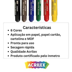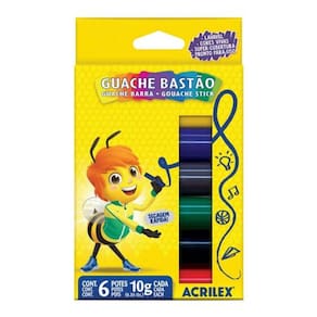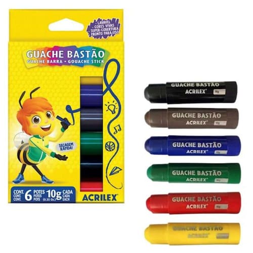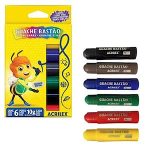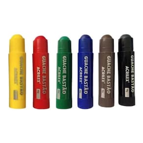 Eleve a sua expressão artística com o Kit Guache Bastão Fosco Acrilex - 6 Cores. Este conjunto é um tesouro para quem busca adicionar cor e vida a projetos em papel, papel cartão, cartolina e MDF. Muito prática, está pronta para uso. Destampe, gire a base e aplique na superfície com facilidade, desfrutando de uma secagem rápida e eficaz.- Cores Intensas: As cores são profundamente vibrantes, cativando os olhos e enriquecendo suas obras.- Super Cobertura: Garanta um resultado com cobertura total, onde suas cores permanecerão nítidas e duradouras.- Secagem Rápida: Com uma secagem veloz, você terá mais tempo para se concentrar na sua criatividade.- Pronto para Uso: O guache está pronto assim que você estiver. Sem misturas, sem espera.Dica ImportanteLembre-se de tampar o bastão após o uso para manter sua qualidade.Conteúdo do Kit- 1 Guache Bastão 10g - Cor Amarelo- 1 Guache Bastão 10g - Cor Vermelho- 1 Guache Bastão 10g - Cor Azul- 1 Guache Bastão 10g - Cor Verde- 1 Guache Bastão 10g - Cor Preto- 1 Guache Bastão 10g - Cor MarromExplore seu potencial artístico e comece a criar hoje mesmo com o Kit Guache Bastão Fosco Acrilex. Garanta o seu conjunto e deixe suas cores fluírem!