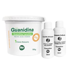 Guanidina biovegetais trihair queratina lanolina alisa 308ml Descrição do produto Cuidados e recomendações antes da aplicação - sempre que utilizar este produto faça o teste de mecha e de toque, pois o processo de fabricação difere das demais marcas existentes. 01 - contém álcali. 02 - cabelos com excesso de brancos podem sofrer alterações de cor. Neste caso é prejudicado o uso de um totalizante que não necessita de oxidantes ou aguardar o prazo necessário para coloração. 03 - utilize apenas cabelos com henê, henna, pastas ou outros alisantes, tinturas progressivas à base sais metálicas , cabelos descoloridos, com reflexo, ou processados por métodos físicos, após 6 meses e com a remoção completa do produto antigo. 04 - após aplicação aguarde 15 dias para fazer uma coloração. 05 - evite tons a partir do louro escuro e ou que utilizem oxidantes de 30 vol ou 40 vol. 06 - não é recomendado o seu uso em gestantes, pois contém substâncias ativas. 07 - não use em crianças. 08 - em caso de contato com os olhos lave-os imediatamente com bastante água. Tendo solicitado suspender o uso e procurar um médico. 09 - não utilizar sob áreas mucosas, pele inflamada ou se a couro cabeludo apresentar lesões ou irritações. 10 - não lave os cabelos ou a fachada massageando por dois dias antes da aplicação do produto. 11 - não utilize escovas ou outros implementos quentes antes, durante ou depois da aplicação do creme relaxante. 12 - proteja o couro cabeludo com o protetor capilar ou vaselina. 13 - este preparado deve ser somente para o fim a que se destina, sendo perigoso para qualquer outro uso art.109 - decreto 79.094/77 . Este produto deverá ser aplicado exclusivamente por profissionais. Material necessário para aplicação: Toalha, pincel, pente plástico de dentes finos/largos, prendedores plásticos, vasilha não metálica e relógio. Marca: Não Informado
