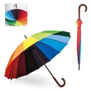 Guarda chuva arco iris 16 varetas em nylon com cabo de madeira. Ideal para se proteger da chuva e do sol. Design moderno e sofisticado Reforçado e com 16 varetas de ferro. Sistema de abertura automática. Peso: 562 gramas sem embalagem Medida aberto: 110 cm Medida fechado: 92 x 7 cm Contém 16 varetas Medida do cabo: 16 x 12 cm Marca: Onze22 Ean: 7908106201464