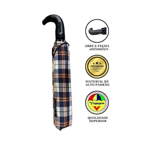 Descrição: Armação e varetas de ferro galvanizado, 08 varetas, varão sextavado galvanizado e cabo curvo com acionador automática, tecido Pongee liso preto e/ou xadrez, peso 610 gramas.