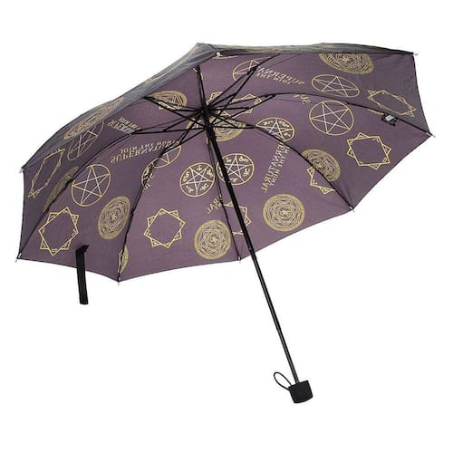 - O guarda-chuva apresenta um design elegante com estampa de símbolos sobrenaturais.