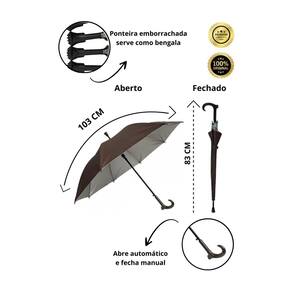 Guarda Chuva Extra Grande Automático Reforçado Voyagem O Guarda-chuva grande reforçado Voyagem, além de muito estiloso, é resistente. - Forte e resistente, capaz de aguentar chuvas fortes e tempestade com vento; - Grande com capacidade para duas pessoas ou mais usar sem se molhar; - Sua varão e varetas é em ferro galvanizado que são os ferros mais populares por ter durabilidade estendida e ótima resistência, além da proteção contra a corrosão de ferrugem; - Possui botão para abertura automática; - Você terá um produto Voyagem que segue padrões internacionais de qualidade. Especificações: - Marca: Voyagem. - Cabo: curvo. - Varão: ferro galvanizado. - Varetas: ferro galvanizado. - Quantidade de varetas: 8 varetas. - Dimensão aberto: 103 cm Diâmetro - Peso: 415g.