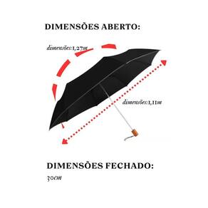 Material Pongee Tamanho aberto 1,15 cm Fechado 29 cm Peso 420 gramas Acompanha capa do guarda chuva Cabo reto de plástico. 10 varetas Abertura em 3 seções Abertura e fechamento manual