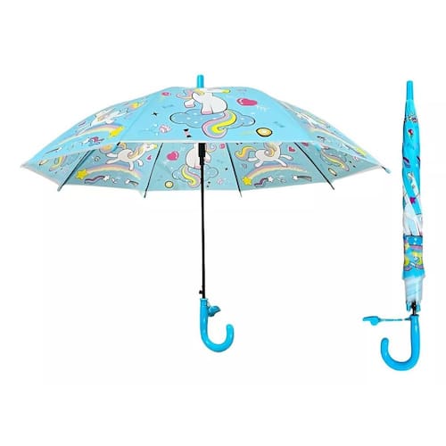 Sombrinha Guarda chuva automático infantil com apito. Cores: Azul, rosa ou verde Guarda chuva automático pequeno resistente contra vento e chuva. Composto por e cobertura em poliéster resistentes. Possui botão acionador de ação simples para abertura do guarda chuva, muito prático basta apenas um toque no botão que o guarda chuva abre e está pronto para uso. Sobre o design ele é moderno e divertido. O apito incorporado, que pode ser em caso de emergência para chamar atenção e pedir ajuda. A escolha do tamanho do guarda-chuva para crianças depende não apenas da idade, mas também da altura da criança e das condições climáticas da região. No entanto, em geral, um guarda-chuva com 100cm aberto e 67cm fechado seria adequado para crianças entre 5 e 8 anos de idade, com uma altura média de cerca de 1,20m a 1,30m. É importante lembrar que as crianças devem sempre estar sob a supervisão de um adulto ao usar um guarda-chuva, independentemente da idade. Este guarda-chuva parece ser uma opção segura e divertida para crianças, com recursos que priorizam a proteção e a segurança delas. Origem: