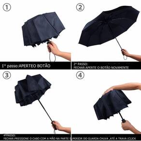 Abre e fecha possui um sistema de acionamento duplo automático,com um clique no botão ele abre e com outro clique no botão ele fecha,assim evitando o trabalho de abrir e fechar guarda chuva em locais de rápida ação,e também não se molhar todo. Também tem o tecido em pongee que não encharca e seca rapidissímo.