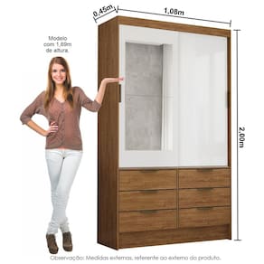 O Guarda-Roupa Sevilha 02 Portas de correr com Espelho, 2,00m de altura, 1,08m de largura e 0,45m de profundidade, combinado com 06 gavetas, 1 prateleira e 1 cabideiro, possibilita ao consumidor acomodar todas as roupas de maneira organizada e com maior visibilidade. As roldanas em aço e o trilho em alumínio potencializam o deslizar das portas.