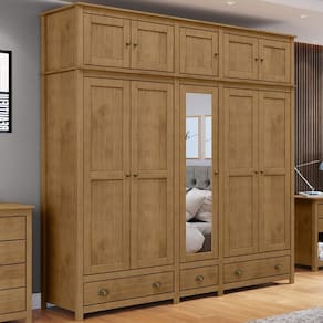 Guarda-roupa Bipartido projetado para quem busca aliar sofisticação e praticidade no seu espaço. Fabricado em madeira maciça, oferece durabilidade e resistência para o seu dia a dia. Com 220cm de largura, 10 portas, sendo 01 com espelho e 03 gavetas, o modelo conta com amplo espaço interno, permitindo organização eficiente de suas roupas e acessórios. Seu design moderno se destaca pelos pés alongados em madeira, conferindo um toque de leveza ao móvel, e seu acabamento com pintura acetinada em verniz PU e UV que realça a beleza natural da madeira. As gavetas possuem corrediças telescópicas, garantindo um deslizamento suave e silencioso, e as portas são equipadas com dobradiças com amortecimento, oferecendo um fechamento sem impactos. Com prateleiras internas e 02 cabideiros em alumínio, o guarda-roupa oferece organização flexível e suficiente para todos os seus itens. Além disso, conta com um maleiro espaçoso, ideal para o armazenamento de itens volumosos como cobertores, roupas de cama, malas e outros objetos. Os puxadores metálicos no estilo concha e botão trazem um charme extra ao design, combinando perfeitamente com o restante da peça. Este móvel chegará em sua casa separado em 04 volumes.