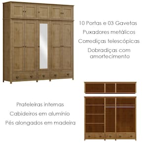 Guarda Roupa 10P 3G Espelho Madeira Maciça 220 cm 9139 Freijo Milani Store - Marrom
