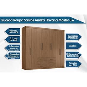 Dimensões(Cm): Comprimento(Profundidade): 46,3cm x Largura: 238,8cm x Altura: 217,6cm Material de Estrutura - Estrutura 100% MDP Tipo de Pintura - Ultravioleta - Texturizada Tipo de Acabamento da Pintura - Semi Brilho Material de Estrutura Fundo Guarda Roupa - Em HDF Diferenciais Guarda Roupas - Maleiro - Divisão Ele/Ela Tipo de Cabideiro - Aéreo Material dos Cabideiros - Cabideira Metálico Tipo de Porta do Guarda-Roupa - Portas de Bater Material das Portas - Portas em MDP Tipo de Dobradiças - Dobradiças Metálicas Quantidade de Portas - 8 Portas de Abrir Material das Gavetas - Gavetas em MDP Tipo de Corrediça - c/ Corrediças Telescópicas Quantidade de Gavetas - 6 Gavetas Material de Estrutura Fundo Gaveta - Em HDF Material das Prateleiras - Prateleiras em MDP Quantidade de Prateleiras - 12 Prateleiras Montagem do Produto - Desmontável Garantia - 3 meses