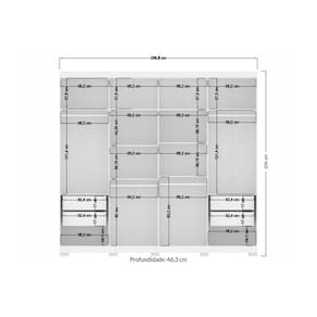 Dimensões(Cm): Comprimento(Profundidade): 46,3cm x Largura: 238,8cm x Altura: 224cm Tamanho dos Acessórios - Casal Material de Estrutura - Estrutura 100% MDP Espessura Material da Estrutura (mm) - Espessura 12mm Tipo de Pintura - Ultravioleta Tipo de Acabamento da Pintura - Semi Brilho Tipo de Acabamento - Acabamento Baixo Relevo Tipo de Modulado - Kit Espelho Diferenciais das Cabeceiras e Painéis p/ Cama Box - Pés em ABS/PVC - Móvel com Espelho Tipo de Moldura do Guarda Roupa - Moldura Robusta com Encabeçamento no Topo Tipo de Rodapé - Possui Rodapé Diferenciais Guarda Roupas - Calceiro - Sapateira - Maleiro - Divisão Ele/Ela Material do Calceiro - Calceiro Metálico Tipo de Cabideiro - Aéreo Material dos Cabideiros - Cabideira Metálico Tipo de Porta do Guarda-Roupa - Portas de Bater Material das Portas - Portas em MDP Tipo de Dobradiças - Dobradiças Metálicas Diferenciais das Portas - Porta c/ Espelho Quantidade de Portas - 8 Portas de Abrir Quantidade de Portas com Espelho - 2 Portas com Espelho Tipo de Espelho - Espelho Externo Quantidade de Espelhos - 4 Espelhos Material das Gavetas - Gavetas em MDP Tipo de Corrediça - c/ Corrediças Telescópicas Quantidade de Gavetas - 4 Gavetas Tipo dos Pés - ABS/PVC Material das Prateleiras - Prateleiras em MDP Quantidade de Prateleiras - 10 Quantidade de Nichos - 2 Nichos Recomendações de Uso - Recomendações de Uso Montagem do Produto - Desmontável - Necessita de montagem - c/ Opções de Montagem - Acompanha Manual de Instalação e Montagem - Complexidade da Montagem Média - Necessita de Ferramentas para Realizar a Montagem Sistema de Montagem - Inclui kit de instalação Certificação de Qualidade - Qualidade Aprovada Nossa Avaliação - Classificação de Qualidade Excelente Garantia - 3 meses Tipo de Puxador - MDF