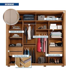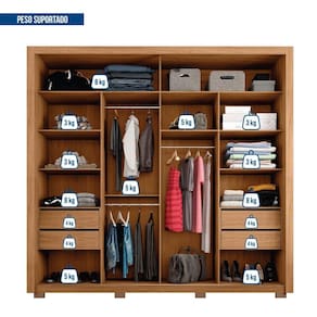 O Roupeiro Suburban Gold da Espresso é um móvel de design moderno e funcional, ideal para quem busca por espaço e organização para suas roupas e pertences pessoais. Fabricado em MDP que garante toda resistência e durabilidade, suas dobradiças de 35 mm, cabideiro em alumínio, gavetas amplas com corrediças telescópicas e puxadores em MDF permitirá o bom funcionamento para sua rotina. Os pés e sapatas são opcionais podendo escolher usar durante a montagem. O detalhe das portas de correr dá um toque especial e moderno ao móvel e ao seu quarto. Acabamento da Prateleira: Pintura UV Escala de Brilho da Prateleira: Fosco Possui Cabideiros: Sim Acabamento da Gaveta: Pintura UV Escala de Brilho da Gaveta: Fosco Material do Puxador da Gaveta: MDF Possui Organizador de Gaveta: Não Acabamento da Porta: Pintura UV Escala de Brilho da Porta: Fosco Material do Puxador da Porta: Alumínio Acabamento dos Pés: Laca Altura dos Pés: 5 Altura Máxima dos Pés: 5.0000 Ambiente Principal: Quarto codigo_ean: 7909903478202 Complexidade da Montagem: Média: pode ser montado por mais de uma pessoa e/ou necessite de maior conhecimento para montagem Cor: Buriti/Cinza Cor do Produto: Buriti/Cinza Cor Flex: Não Cor Interna: Buriti Escala de Brilho: Fosco Gaveta com Chave: Não Guarda-Roupa Suporta Até (kg): 68 kg Informações Complementares: Kit Luz de Led Opcional Itens Inclusos: 1 Guarda Roupa, Kit ferragens e Manual de Montagem Linha ou Coleção: Rooms Manual de Especificação Técnica: https://product-hub-prd.madeiramadeira.com.br/876216/documents/3d5a33c8-ead9-48ec-a172-d22fed82a68992ftroupeiropraticus244g2p.pdf Manual de Montagem e Instalação: https://product-hub-prd.madeiramadeira.com.br/876216/documents/19af525a-5030-4188-82e4-86d48ede71a61eqroupeiropraticusediCAoa.pdf Material da Gaveta: MDF Material da Porta: MDF Material da Prateleira: MDF Material dos Pés: ABS Material Principal: MDF modular: Não Montagem Flex: Não Necessita Montagem: Sim Origem do Produto: Nacional Peso: 182,21 kg Peso Máximo por Gaveta: 4 kg Peso Máximo por Prateleira: 8 kg Possui Espaço para Vestidos Longos: Sim Possui Espelho: Não Possui Espelho Interno: Não Possui Ganchos: Não Possui iluminação: Sim Possui Painel de TV: Não Possui Pés: 08 Possui Portas: Sim Possui Prateleiras: Sim Possui Sapateira: Não Produto Montado: Sim Quantidade de Gavetas: 04 Gavetas Quantidade de Prateleiras: 10 Prateleiras Recomendações de Uso, Manutenção e Limpeza: Limpar com pano macio levemente umedecido e em seguida pano macio seco. Não utilizar produtos abrasivos (lixas, esponjas) e/ou produtos a base de solventes (thinner, aguarrás). Sapatas Niveladoras: Sim Sistema de Montagem: Utiliza-se na montagem do produto sistema de fixação minifix, dobradiças, dispositivos angulares, cavilhas, parafusos, porcas cilindricas, entre outros; Suporta Até (kg): 68 kg Tipo de Corrediça da Gaveta: Metálica Telescópica Tipo de Dobradiça/Corrediça da Porta: Metálica Tipo de Gaveta: Interna Tipo de Guarda-Roupa: Casal Tipo de Puxador da Gaveta: Embutido Tipo de Puxador da Porta: Externo Ean: 7909903478202