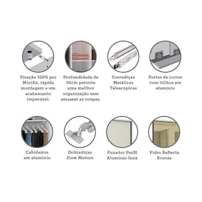 O Guarda Roupa Modulado Prime foi desenvolvido se adequando a vários espaços, de grandes a pequenos. Possui 236 cm de altura oferece divisórias para atender diversas necessidades, profundidade de 56cm possibilitando acomodar roupas sem amassar. Produzido em MDP de 15mm, duas portas de correr com trilhos em alumínio, corrediças telescópicas, a montagem é inteira por minifix que proporciona um acabamento impecável e fundos embutidos com perfil usinado para melhor acabamento e maior resistência.